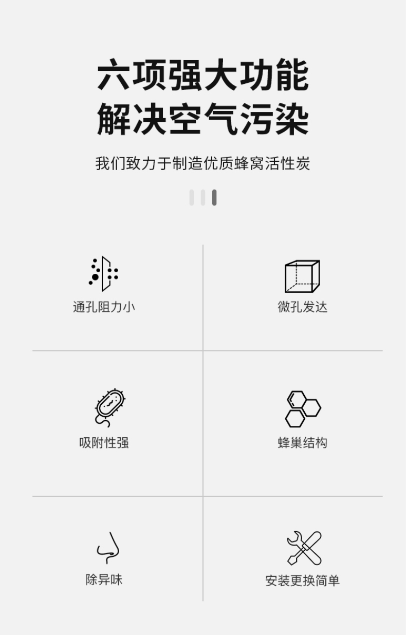 二、防油霧。蜂窩活性炭是微孔發(fā)達物質(zhì),微孔對于甲醛、苯、二甲苯等小分子粒徑的有很好,而對于油霧等大分子類物質(zhì),蜂窩活性炭的吸附能力就會減弱,油脂甚至會堵塞蜂窩活性炭微孔。