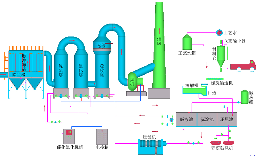 5.副產(chǎn)品可資源化進(jìn)行利用,并產(chǎn)生一定的經(jīng)濟(jì)效益。對(duì)鋼鐵公司是循環(huán)經(jīng)濟(jì),對(duì)貧硫國家和農(nóng)業(yè)大國而言,在治理污染的同時(shí)充分回收利用硫資源(濃硫酸、硫酸、硫磺)或生產(chǎn)化肥—硫胺等等均有重要和深遠(yuǎn)的歷史意義和現(xiàn)實(shí)意義。