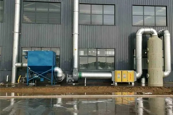 經(jīng)水噴淋塔先過濾掉雜質(zhì),惡臭氣體經(jīng)水噴淋塔定量吸收后,再經(jīng)過光氧催化燃燒設備進一步分解,UV光解除臭設備對惡臭物質(zhì)有較好的處理效果,對惡臭氣體特別是有機廢氣能分解98%以上,此方法脫臭效果好,可適用于消除多種組分的惡臭物質(zhì)的需要,以達更好的除臭效果。