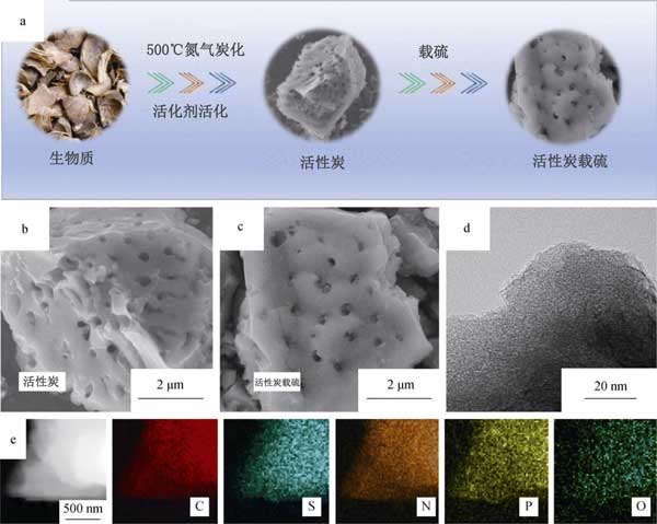 首先,除去生物質(zhì)的污垢和表面雜質(zhì),用清水徹底清洗活性炭原材料,然后用蒸餾水反復清洗,然后將它們粉碎成碎片,然后在烤箱中100°C下干燥。為了進行預碳化,將干燥的生物質(zhì)在氮氣氛下的真空管式爐中在500°C的溫度下熱解2小時,以去除少量有機分子。隨后,為了通過化學活化提高比表面積,將預碳酸化的生物質(zhì)以1:4的重量比浸入作為化學活化劑的水溶液中,然后充分攪拌6小時以確保完全滲透。之后,將混合物在N 2下于900°C退火1小時。最后,用鹽酸反復洗滌退火后的樣品,然后用過量的蒸餾水沖洗以獲得中性pH。最終樣品通過在80°C的空氣中干燥獲得,并標記為多孔活性炭。相比之下,使用相同步驟制備的未添加活化劑的產(chǎn)品被標記為無孔活性炭。接著使用這兩種活性炭升級成加硫復合材料,將升華后的硫(純度>99.95%)和相應的活性炭粉末(重量比為60:40)充分混合并在研缽中研磨。然后,將獲得的混合物用特氟隆容器密封在高壓釜中。在155°C下熱處理12小時后,獲得了多孔摻硫活性炭和無孔摻硫活性炭復合材料。