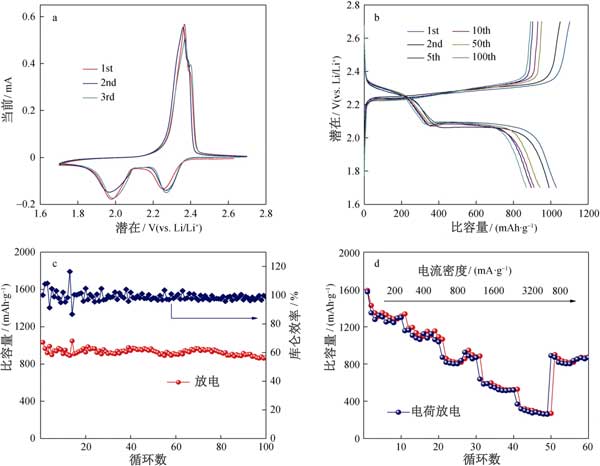 為了評估活性炭作為陰極的電化學性能,將鋰箔作為陽極組裝到鋰硫電池的紐扣電池中。用于第一,第二和第三個循環(huán)的循環(huán)伏安圖(CV)曲線上在0.05毫伏·秒的掃描速率的電位窗口進行(圖2A)。在第一循環(huán)期間,觀察到兩個陰極峰在2.26和1.97 V,CV曲線中最初的幾個循環(huán)幾乎重疊,這表明循環(huán)穩(wěn)定性極佳,容量保持率相對較高?;钚蕴康暮汶娏鞒潆?放電曲線和循環(huán)穩(wěn)定性的測試中,如在圖中所描述2B、C?;钚蕴侩姌O的首次放電容量為1045 mAh·g -1,約為硫理論容量的62.5%。此外,活性炭電極在第100次循環(huán)時也顯示出869.8mAh·g -1的放電容量。如圖2d所示測量活性炭的倍率性能,在200–3200 mA·g -1下表現(xiàn)出1260、1050、806、513、290 mAh·g -1的可逆放電容量。此外,當電流密度達到800 mA·g時,活性炭陰極的放電容量為802 mAh·g -1。多孔活性炭材料表現(xiàn)出中等的鋰硫電池電化學性能,顯示出高性能鋰硫電池的潛力。