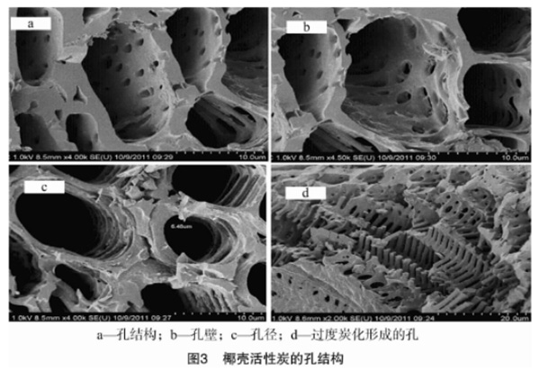 從圖3可以看出,椰殼活性炭的孔結(jié)構(gòu)較為發(fā)達,孔的大小也比較均勻。在大孔的孔壁上,可以清楚地觀測到有較小的孔存在(圖3-a),小孔的大小也比較均勻,而且在孔結(jié)構(gòu)比較多的部分位置,孔壁甚至以網(wǎng)狀結(jié)構(gòu)出現(xiàn)(圖3-b)。椰殼活性炭表面比較均勻的孔直徑約為5-10um(圖3-c)。在部分活化過度的位置(圖3-d),可以清楚地看出即使椰殼活性炭的表面看起來的孔較少,但是內(nèi)部仍然具有非常發(fā)達的孔結(jié)構(gòu)。