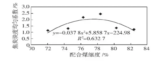 焦炭塊度均勻系數(shù)隨著配合煤細(xì)度的增加呈拋物線形式, 在約77%時(shí)達(dá)最大值。為了提高焦炭的大塊率, 因而配合煤細(xì)度也不易過高, 經(jīng)測(cè)算細(xì)度為76%時(shí), 焦炭大塊率較好。